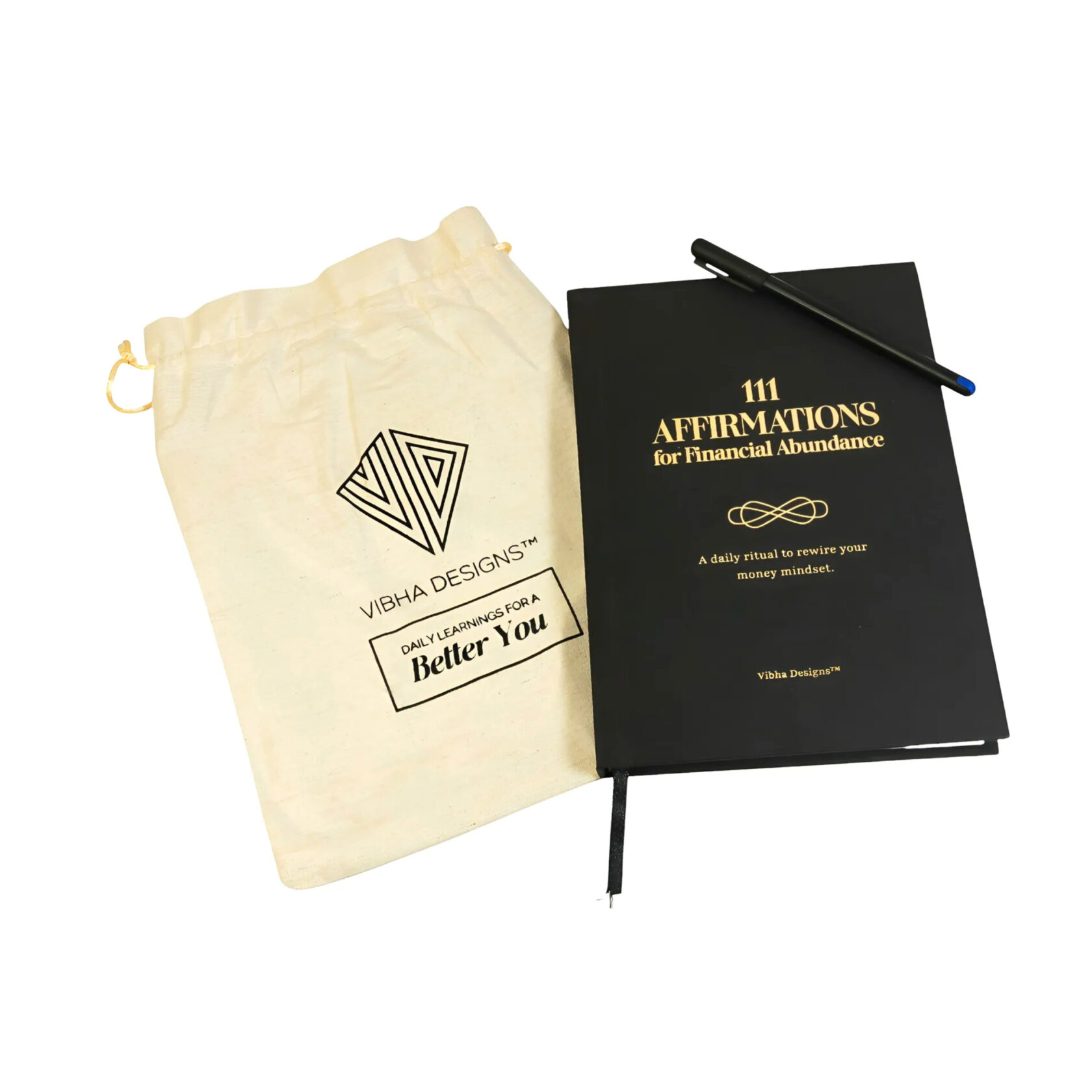 111 Affirmations for Financial Abundance is a premium guided writing journal designed to help you reframe your money mindset through conscious repetition. With 125 pages, a luxurious black hardbound cover, and gold leaf detailing, it turns daily affirmations into a powerful abundance ritual.