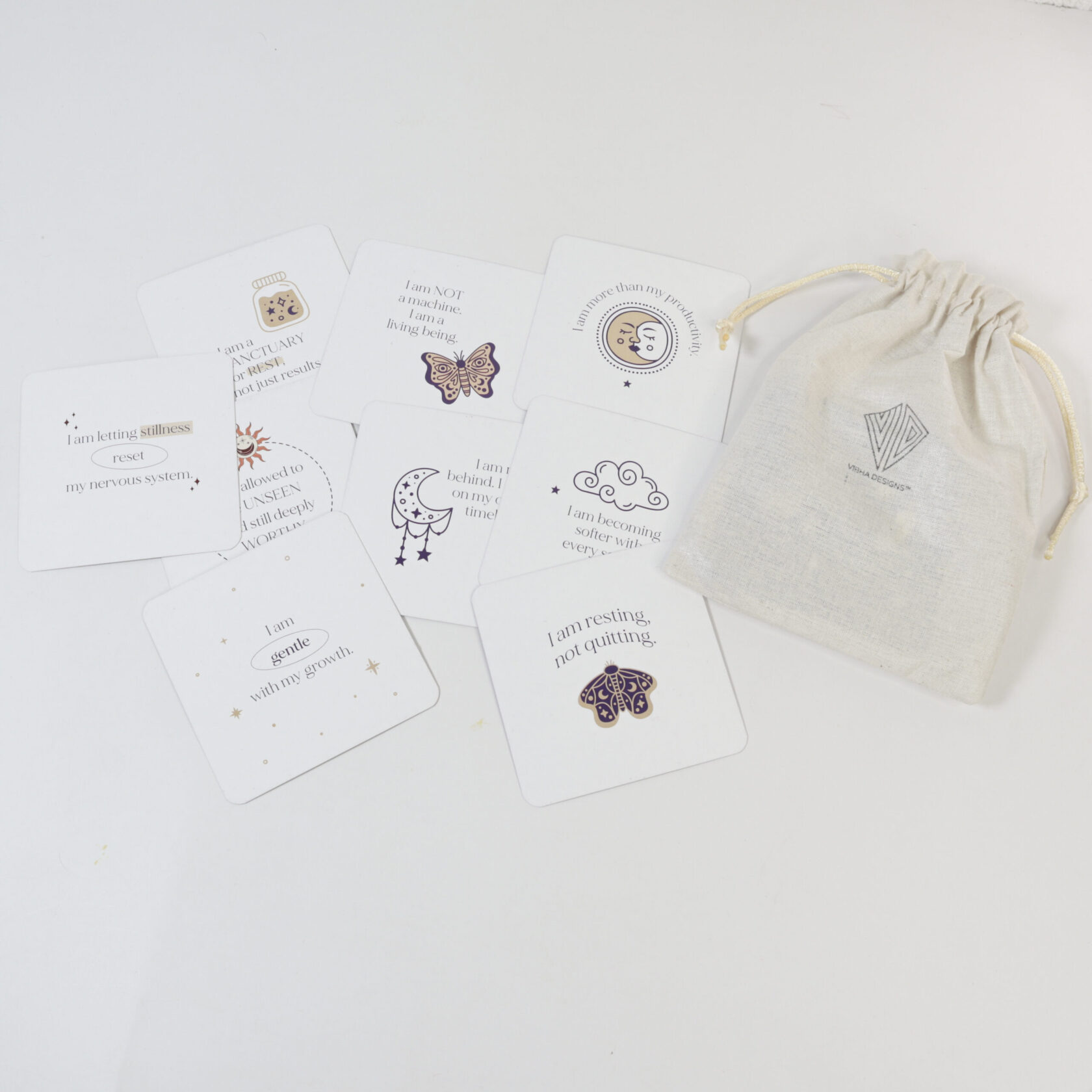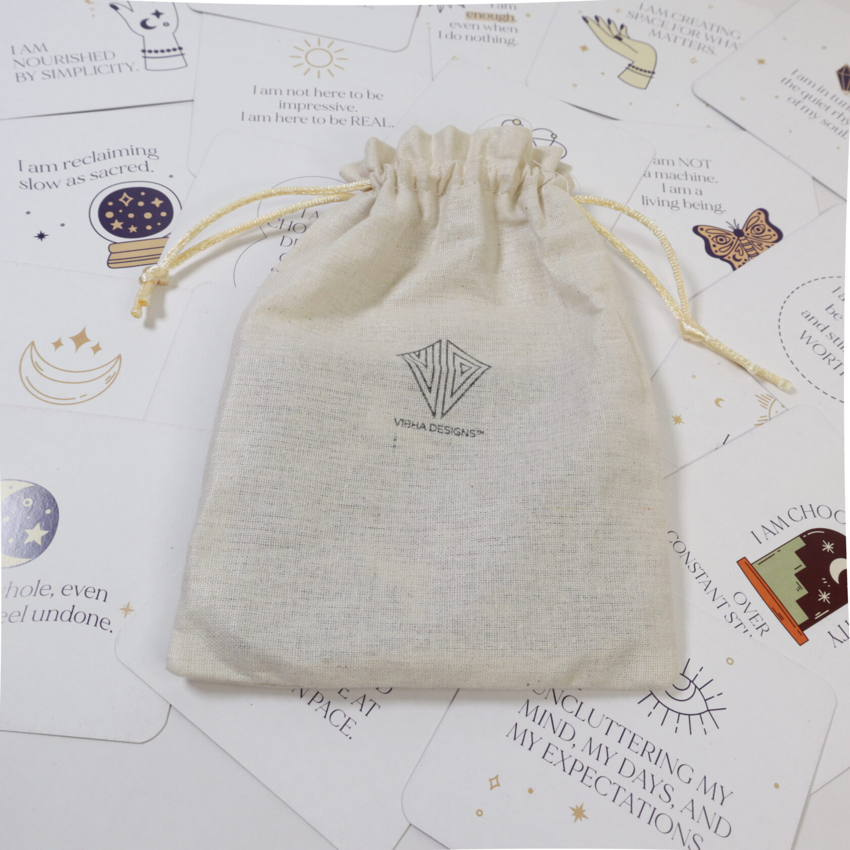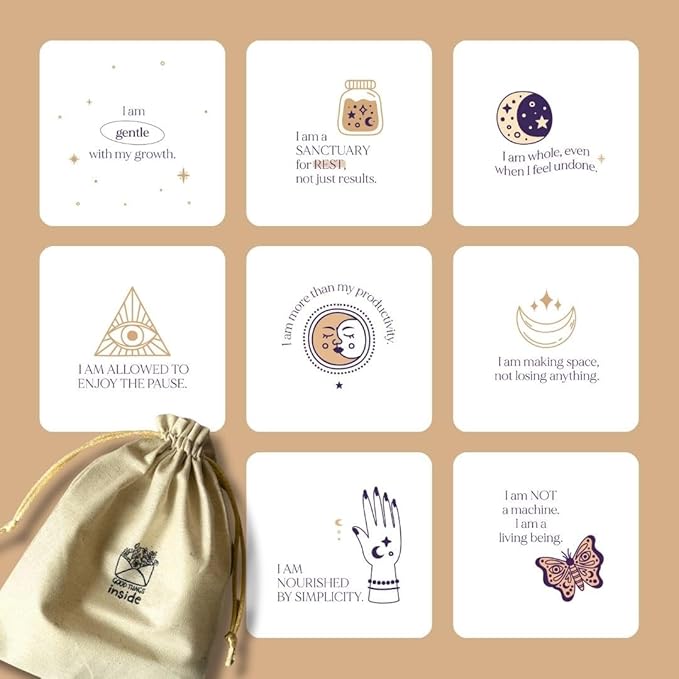 Rediscover your inner power with Vibha Designs’ I Am Affirmation Cards for Women — a beautifully crafted card deck that encourages you to pause, reflect, and reconnect with your true self. This set includes 30 thoughtfully written affirmation cards, each featuring a unique “I Am” message like I am strong, I am worthy, or I am enough. These statements are designed to help you overcome doubt, build self-esteem, and develop a mindful, loving connection with yourself. Each card is a 3.5 x 3.5 inch square – small enough to keep on your desk, bedside table, vision board, or carry in your handbag. Whether you’re beginning your day, journaling, or winding down before sleep, these cards act as gentle daily reminders of your worth and resilience. What makes this deck even more special is the eco-conscious cotton bag it comes in – reusable, soft, and sustainable. It replaces bulky boxes or plastic pouches, making it easier to carry and more Earth-friendly. With its aesthetic minimalist design, this deck isn’t just functional – it’s also visually calming and gift-worthy. It’s a beautiful companion for your self-care rituals, meditation practices, or wellness routines. Give it as a gift to a friend, daughter, or therapist – or keep it as your personal tool for growth and grounding. These affirmation cards are more than just words – they’re a quiet revolution of kindness to self.