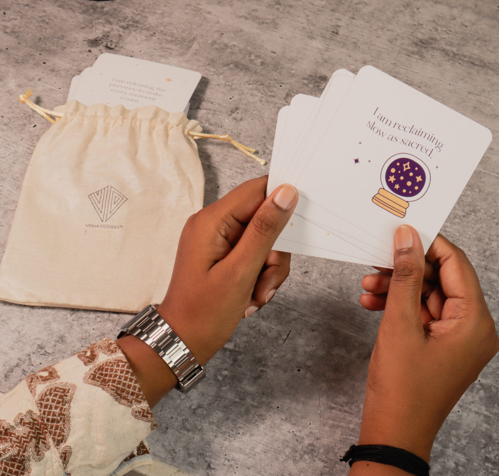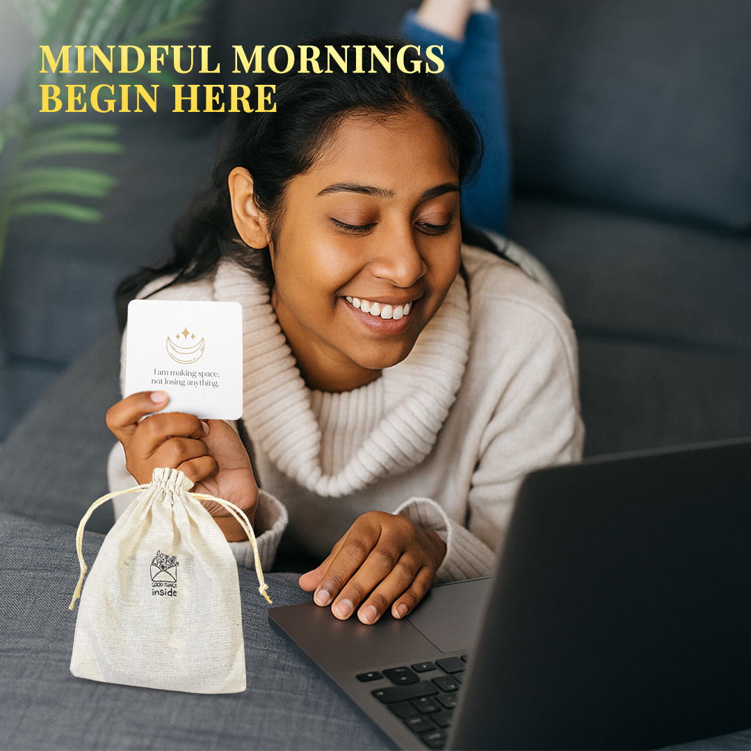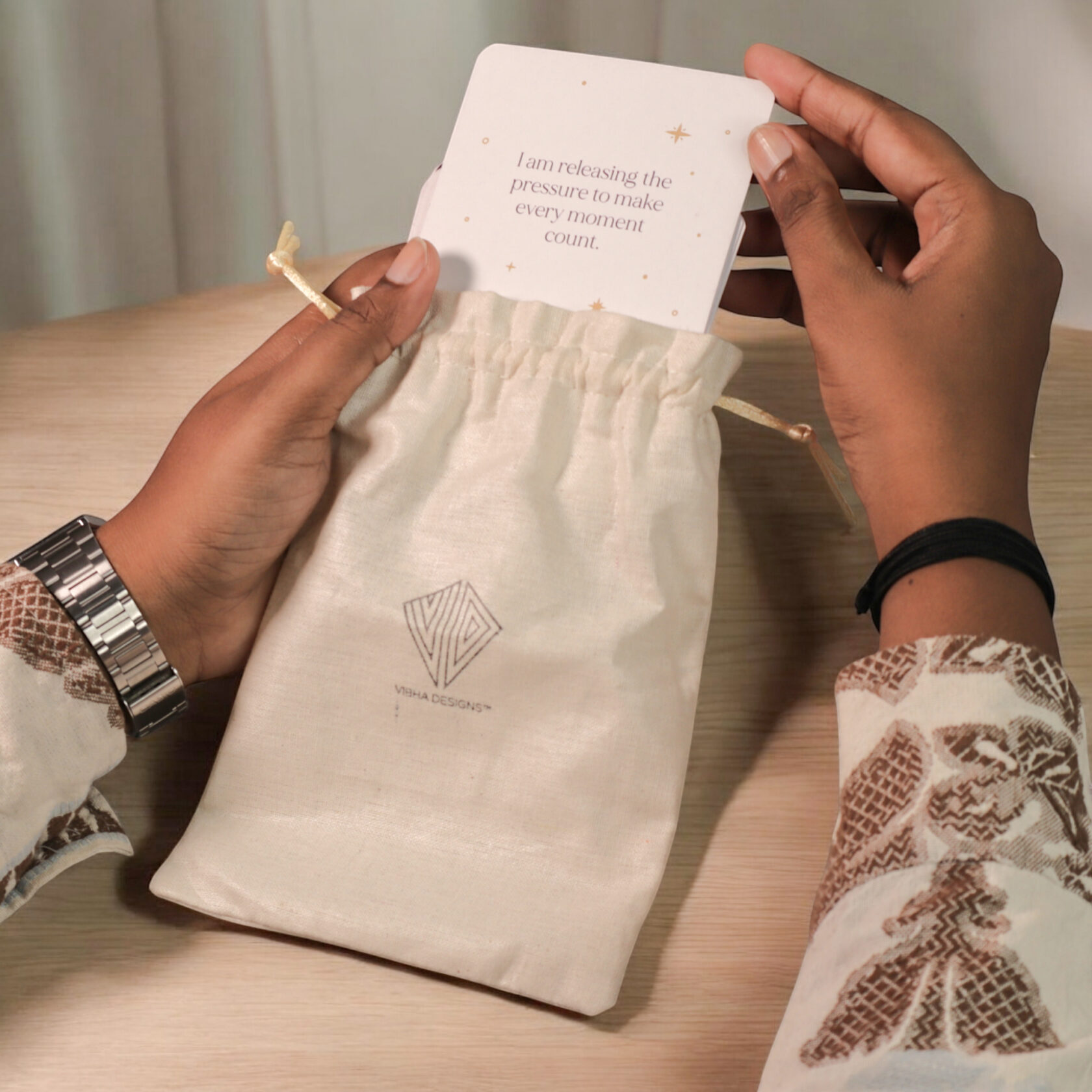 Rediscover your inner power with Vibha Designs’ I Am Affirmation Cards for Women — a beautifully crafted card deck that encourages you to pause, reflect, and reconnect with your true self. This set includes 30 thoughtfully written affirmation cards, each featuring a unique “I Am” message like I am strong, I am worthy, or I am enough. These statements are designed to help you overcome doubt, build self-esteem, and develop a mindful, loving connection with yourself. Each card is a 3.5 x 3.5 inch square – small enough to keep on your desk, bedside table, vision board, or carry in your handbag. Whether you’re beginning your day, journaling, or winding down before sleep, these cards act as gentle daily reminders of your worth and resilience. What makes this deck even more special is the eco-conscious cotton bag it comes in – reusable, soft, and sustainable. It replaces bulky boxes or plastic pouches, making it easier to carry and more Earth-friendly. With its aesthetic minimalist design, this deck isn’t just functional – it’s also visually calming and gift-worthy. It’s a beautiful companion for your self-care rituals, meditation practices, or wellness routines. Give it as a gift to a friend, daughter, or therapist – or keep it as your personal tool for growth and grounding. These affirmation cards are more than just words – they’re a quiet revolution of kindness to self.
