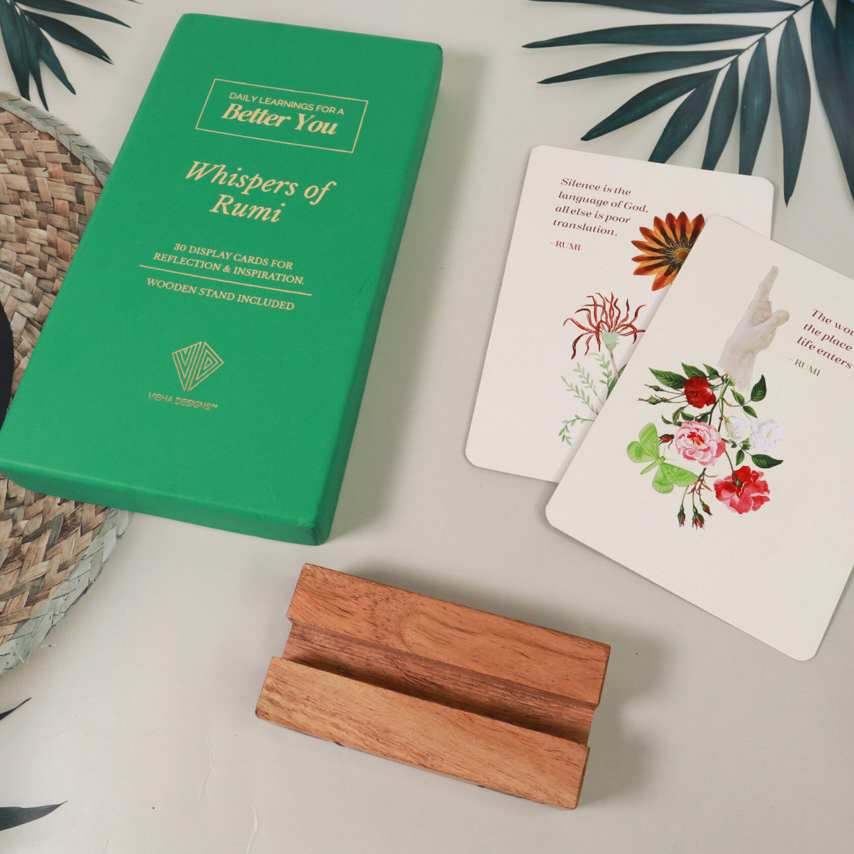 The Vibha Designs Combo of Japanese & Rumi Wisdom Cards Set is a unique blend of Eastern and Western philosophies that offer a perfect daily dose of inspiration and mindfulness. Featuring a set of 30 cards from both Japanese Zen Wisdom and the poetic brilliance of Rumi, this combo encourages positivity, resilience, and inner peace. Each card is filled with empowering affirmations and deep insights that will guide you towards a calmer, more focused state of mind. Whether you’re a seeker of self-growth or someone looking to improve your daily mindset, these cards provide a simple yet powerful way to incorporate positive affirmations into your routine. The set also comes with a beautifully crafted wooden display stand, making it easy to display and access your cards while adding elegance to any space. Perfect for your bedroom, office, or meditation corner. These cards are not only designed to enhance your personal growth journey but also serve as a thoughtful and unique gift for friends, family, or loved ones. Ideal for birthdays, anniversaries, or special occasions, the Vibha Designs Wisdom Cards Set combines beauty, functionality, and spiritual guidance in a single, inspiring product. Made with high-quality, durable cardstock, these cards are designed to withstand regular use. The eco-friendly materials used reflect the brand’s commitment to sustainability. Add this incredible set to your daily routine for moments of reflection, peace, and self-discovery.